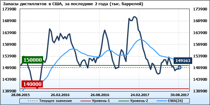 Спрос на дистилляты упал на -0.167 до 3.91 млн. баррелей. Производство дистиллятов упало на -0.036 до 5.055 млн. баррелей. Импорт дистиллятов упал на -0.048 до 0.084 млн. баррелей. Экспорт дистиллятов упал на -0.02 до 1.122 млн. баррелей в день.