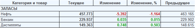Коммерческие запасы нефти в США упали на -5.392 до 457.773 млн. баррелей. Запасы бензина выросли на 0.035 до 229.937 млн. баррелей. Запасы дистиллятов выросли на 0.748 до 149.363 млн. баррелей.