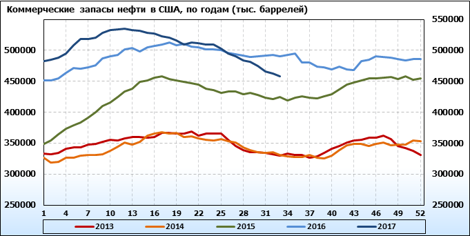 Коммерческие запасы нефти в США, EIA (U.S. Energy Information Administration). Данные на 30.08.2017