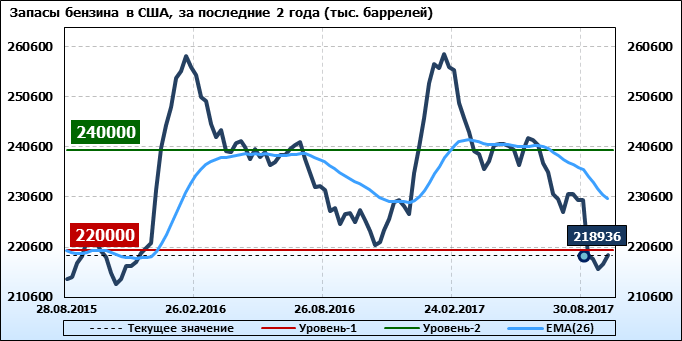 Коммерческие запасы нефти в США упали на -6.023 до 464.963 млн. баррелей. Запасы бензина выросли на 1.644 до 218.936 млн. баррелей. Запасы дистиллятов упали на -2.606 до 135.439 млн. баррелей. Запасы в хранилище Кушинг выросли на 1.525 до 62.462 млн. баррелей.