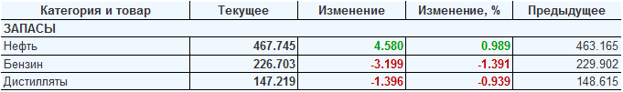 Коммерческие запасы нефти в США выросли на 4.58 до 467.745 млн. баррелей. Запасы бензина упали на -3.19 до 226.712 млн. баррелей. Запасы дистиллятов упали на -1.396 до 147.219 млн. баррелей.