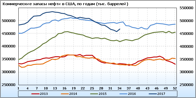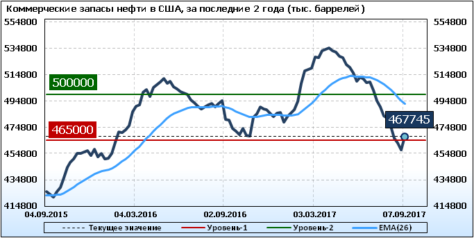 Коммерческие запасы нефти в США, EIA (U.S. Energy Information Administration). Данные на 7.09.2017