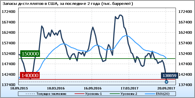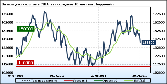 Спрос на дистилляты вырос на 0.207 до 4.264 млн. баррелей. Производство дистиллятов выросло на 0.57 до 4.543 млн. баррелей. Импорт дистиллятов упал на -0.051 до 0.085 млн. баррелей. Экспорт дистиллятов упал на -509.823 до 1.177 млн. баррелей в день.