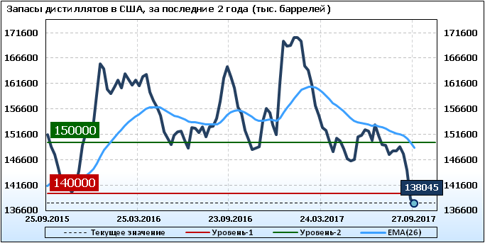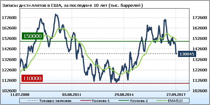 Спрос на дистилляты упал на -0.518 до 3.746 млн. баррелей. Производство дистиллятов выросло на 0.096 до 4.639 млн. баррелей. Импорт дистиллятов упал на -0.001 до 0.084 млн. баррелей. Экспорт дистиллятов упал на -0.084 до 1.093 млн. баррелей в день.