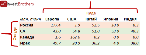Экспорт сырой нефти по направлениям (млн тонн в год)