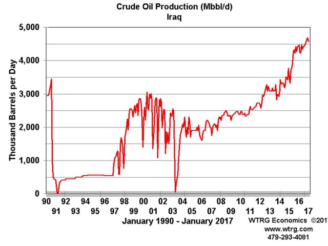 Иракский министр нефти заявил в начале этого года, что его страна может в этом году увеличить производство до 5 млн баррелей в сутки. Он мог говорить о пропускной способности, а не о том, что будет фактически произведено, но это будет намного превышать обещанный лимит Ирака в 4,35 млн баррелей в день.