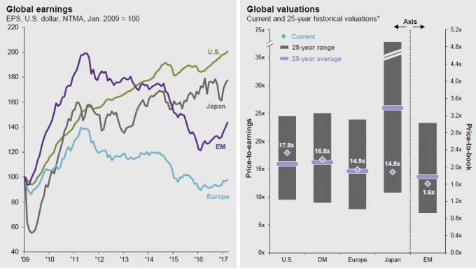 Но с точки зрения финансовой оценки, Европа и страны с развивающейся экономикой выглядят более привлекательно. Коэффициент P/E в них лишь немного превышает средний показатель.