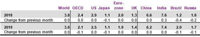 Прогноз относительно роста мировой экономики в 2018 и 2019 годах остался неизменным и по-прежнему обещает 3.8% и 3.6%, соответственно. Несмотря на это, многие факторы, в особенности возникающие проблемы в странах с формирующейся рыночной экономикой и развивающихся странах, выступают противовесом прогнозам о растущей мировой экономике и способствуют дальнейшему пересмотру показателей в сторону снижения.