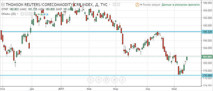 Индикатор сырьевого рынка Thompson Reuters Commodities Index показал на прошедшей неделе хорошую повышательную динамику, практически отыграв падение недельной давности. В понедельник – вторник торги проходили вблизи уровня 178 пунктов и характеризовались низкой волатильностью. Начиная со среды активность трейдеров возросла, и индекс пошел в рост. В четверг и пятницу рынок открывался с бычьим ГЭПом. Общее недельное повышение составило 3,767 пункта или 2,1%. Торги завершились на значении 181,691 пункта (см. график 2).