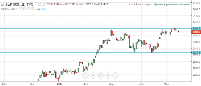 Недельные торги по индексу S&P 500 начались на отметке 2 399,9 пункта. Во вторник, 9 мая, индикатор обновил исторический максимум, достигнув уровня 2 403,9 пункта (см. график 3). Однако закрепиться выше 2 400 пунктов быкам не удалось. Вторую половину недели котировки, очень вяло, но все же двигались вниз. В итоге за прошедшую неделю барометр американского фондового рынка потерял 9 пунктов или 0,4%. Закрытие торгов состоялось на уровне 2 390,9 пункта.