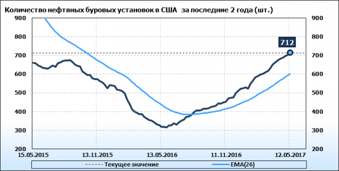Согласно информации Baker Hughes, количество нефтяных буровых установок в США на 12.05.2017 вновь выросло. На этот раз рост составил 9 единиц, а общее количество достигло 712 штук (см. график 6). Данное событие не оказало сильного воздействия на динамику нефтяных котировок.