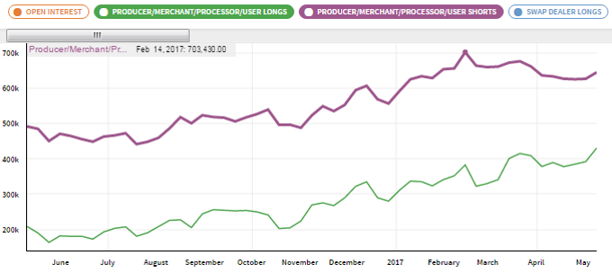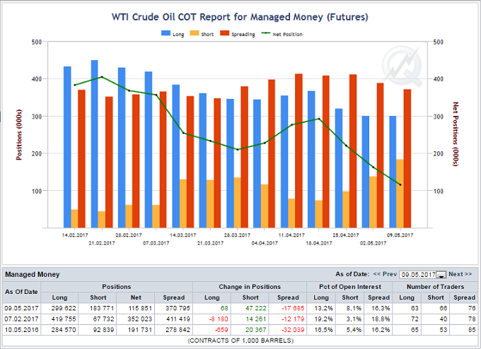 Динамика дельты открытых позиций управляющих фондами диаметрально противоположна изменению соотношения позиций производителей. Разница между короткими и длинными позициями Managed Money сокращается третью неделю подряд. По данным на 9 мая длинных позиций по-прежнему больше чем коротких – в 1,6 раза. Вместе с тем, разница неделю назад составляла 2,2 раза, двумя неделями ранее 3,3, три недели назад лонгов было больше в 5 раз.