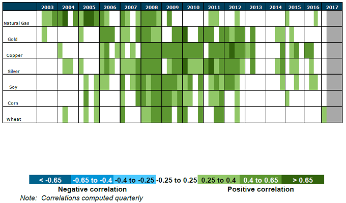 В 2016 году максимальная корреляция нефтяных котировок наблюдалась с медью, восстановившись до уровня, наблюдавшегося в 2008 – 2012 годах, 40 – 65%.