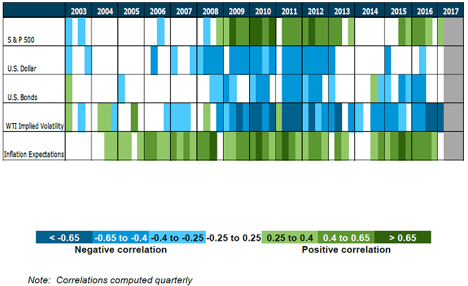 Самая сильная отрицательная корреляция доходности фьючерсов на нефть наблюдается с их ожидаемой волатильностью (WTI Implied Volatility), т.е. субъективной оценкой рынком будущей волатильности нефтяных котировок. Так, чем выше ожидаемая волатильность нефти, тем ниже ее доходность. Во второй половине 2016 и первом квартале 2017 года корреляция выше 65%.