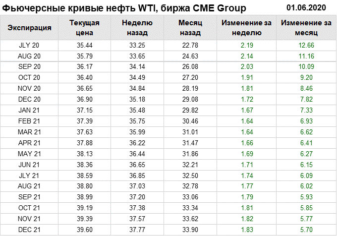 Нефть. Фьючерсные кривые на 1 июня 2020