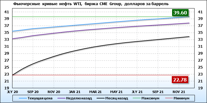 На 01.06.20 стоимость нефти марки WTI на бирже CME Group по контракту JLY 20 составила 35.44 долларов за баррель. За прошедшую неделю стоимость нефти марки WTI выросла на 2.19 $/баррель. Как мы видим на графике, фьючерсная кривая на всем своем протяжении находится в состоянии контанго. Трейдеры не предполагают превышения предложения над спросом при сохранении текущих цен.