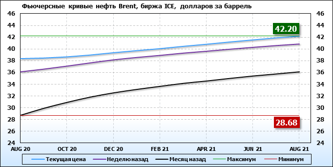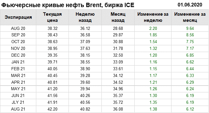 На 01.06.20 стоимость нефти марки Brent на бирже ICE по контракту AUG 20 составила 38.32 долларов за баррель. За прошедшую неделю стоимость нефти марки Brent выросла на 2.2 $/баррель. Как мы видим на графике, фьючерсная кривая на всем своем протяжении находится в состоянии контанго.