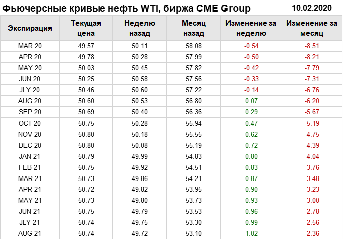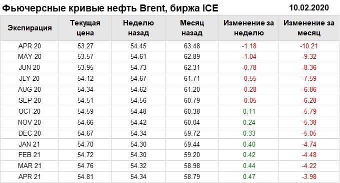 Нефть. Фьючерсные кривые на 10 февраля 2020