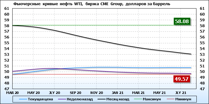 На 10.02.20 стоимость нефти марки WTI на бирже CME Group по контракту MAR 20 составила 49.57 долларов за баррель. За прошедшую неделю стоимость нефти марки WTI упала на 0.54 $/баррель. Как мы видим на графике, фьючерсная кривая имеет периоды, когда более дальний фьючерс дешевле ближнего. Состояние бэквардации наблюдаем на следующих контрактах: DEC 20; JAN 21; FEB 21; MAR 21; APR 21; JLY 21; AUG 21. Таким образом, трейдеры предполагают, что возможно превалирование предложения над спросом в указанные периоды, если рынок будет находиться на данных ценовых уровнях.