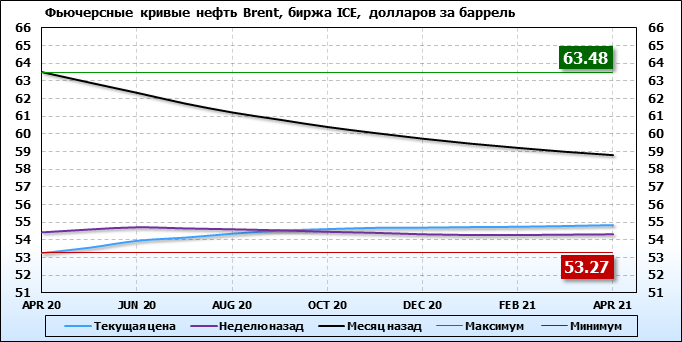На 10.02.20 стоимость нефти марки Brent на бирже ICE по контракту APR 20 составила 53.27 доллара за баррель. За прошедшую неделю стоимость нефти марки Brent упала на 1.18 $/баррель. Как мы видим на графике, фьючерсная кривая на всем своем протяжении находится в состоянии контанго.