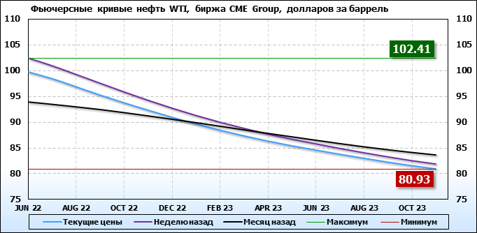 На 10.05.22 стоимость нефти марки WTI на бирже CME Group по контракту JUN 22 составила 99.76 доллара за баррель. За прошедшую неделю стоимость нефти марки WTI упала на 2.65 $/баррель. Как мы видим на графике, фьючерсная кривая имеет периоды, когда более дальний фьючерс дешевле ближнего. Состояние бэквардации наблюдаем на следующих контрактах: JLY 22; AUG 22; SEP 22; OCT 22; NOV 22; DEC 22; JAN 23; FEB 23; MAR 23; APR 23; MAY 23; JUN 23; JLY 23; AUG 23; SEP 23; OCT 23; NOV 23. Таким образом, трейдеры предполагают, что возможно превалирование предложения над спросом в указанные периоды, если рынок будет находиться на данных ценовых уровнях.