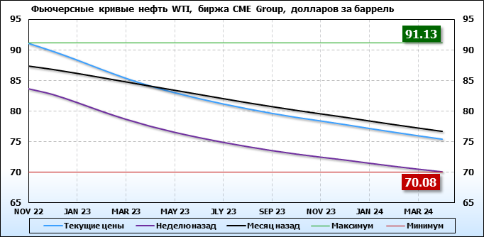 На 10.10.22 стоимость нефти марки WTI на бирже CME Group по контракту NOV 22 составила 91.13 доллара за баррель. За прошедшую неделю стоимость нефти марки WTI выросла на 7.5 $/баррель. Как мы видим на графике, фьючерсная кривая имеет периоды, когда более дальний фьючерс дешевле ближнего. Состояние бэквардации наблюдаем на следующих контрактах: DEC 22; JAN 23; FEB 23; MAR 23; APR 23; MAY 23; JUN 23; JLY 23; AUG 23; SEP 23; OCT 23; NOV 23; DEC 23; JAN 24; FEB 24; MAR 24; APR 24. Таким образом, трейдеры предполагают, что возможно превалирование предложения над спросом в указанные периоды, если рынок будет находиться на данных ценовых уровнях.