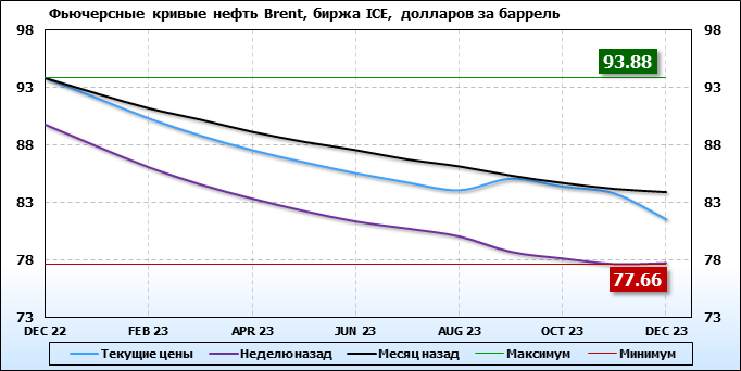 На 10.10.22 стоимость нефти марки Brent на бирже ICE по контракту DEC 22 составила 93.88 доллара за баррель. За прошедшую неделю стоимость нефти марки Brent выросла на 4.12 $/баррель. Как мы видим на графике, фьючерсная кривая имеет периоды, когда более дальний фьючерс дешевле ближнего. Состояние бэквардации наблюдаем на следующих контрактах: JAN 23; FEB 23; MAR 23; APR 23; MAY 23; JUN 23; JLY 23; AUG 23; ; OCT 23; NOV 23; DEC 23. Таким образом, трейдеры предполагают, что возможно превалирование предложения над спросом в указанные периоды, если рынок будет находиться на данных ценовых уровнях.
