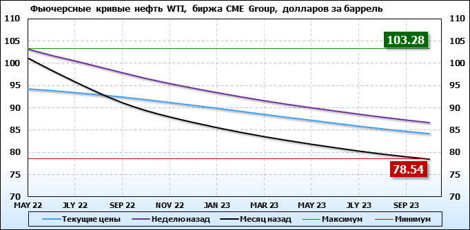 На 11.04.22 стоимость нефти марки WTI на бирже CME Group по контракту MAY 22 составила 94.29 доллара за баррель. За прошедшую неделю стоимость нефти марки WTI упала на 8.99 $/баррель. Как мы видим на графике, фьючерсная кривая имеет периоды, когда более дальний фьючерс дешевле ближнего. Состояние бэквардации наблюдаем на следующих контрактах: JUN 22; JLY 22; AUG 22; SEP 22; OCT 22; NOV 22; DEC 22; JAN 23; FEB 23; MAR 23; APR 23; MAY 23; JUN 23; JLY 23; AUG 23; SEP 23; OCT 23. Таким образом, трейдеры предполагают, что возможно превалирование предложения над спросом в указанные периоды, если рынок будет находиться на данных ценовых уровнях.