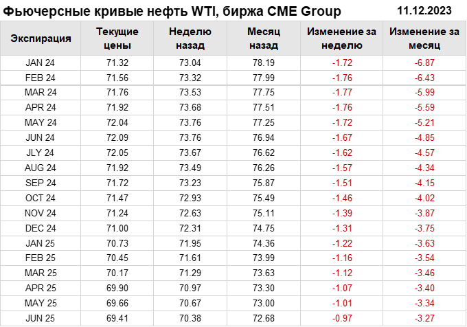 Нефть. Фьючерсные кривые на 11 декабря 2023