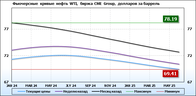 На 11.12.23 стоимость нефти марки WTI на бирже CME Group по контракту JAN 24 составила 71.32 доллара за баррель. За прошедшую неделю стоимость нефти марки WTI упала на 1.72 $/баррель. Как мы видим на графике, фьючерсная кривая имеет периоды, когда более дальний фьючерс дешевле ближнего. Состояние бэквардации наблюдаем на следующих контрактах: JLY 24; AUG 24; SEP 24; OCT 24; NOV 24; DEC 24; JAN 25; FEB 25; MAR 25; APR 25; MAY 25; JUN 25. Таким образом, трейдеры предполагают, что возможно превалирование предложения над спросом в указанные периоды, если рынок будет находиться на данных ценовых уровнях.