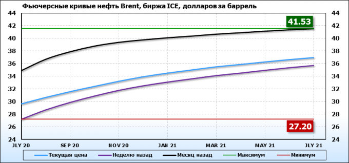 На 11.05.20 стоимость нефти марки Brent на бирже ICE по контракту JLY 20 составила 29.63 долларов за баррель. За прошедшую неделю стоимость нефти марки Brent выросла на 2.43 $/баррель. Как мы видим на графике, фьючерсная кривая на всем своем протяжении находится в состоянии контанго.