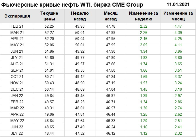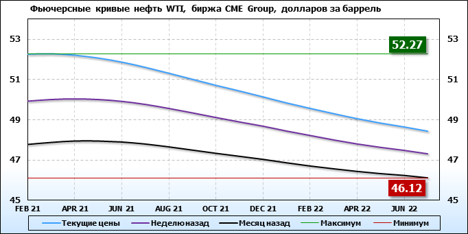 На 11.01.21 стоимость нефти марки WTI на бирже CME Group по контракту FEB 21 составила 52.25 доллара за баррель. За прошедшую неделю стоимость нефти марки WTI выросла на 2.32 $/баррель. Как мы видим на графике, фьючерсная кривая имеет периоды, когда более дальний фьючерс дешевле ближнего. Состояние бэквардации наблюдаем на следующих контрактах: APR 21; MAY 21; JUN 21; JLY 21; AUG 21; SEP 21; OCT 21; NOV 21; DEC 21; JAN 22; FEB 22; MAR 22; APR 22; MAY 22; JUN 22; JLY 22. Таким образом, трейдеры предполагают, что возможно превалирование предложения над спросом в указанные периоды, если рынок будет находиться на данных ценовых уровнях.
