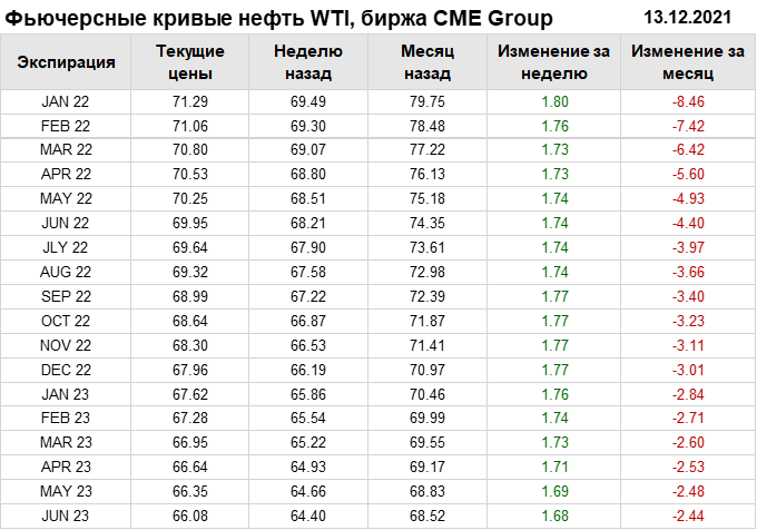 Нефть. Фьючерсные кривые на 13 декабря 2021