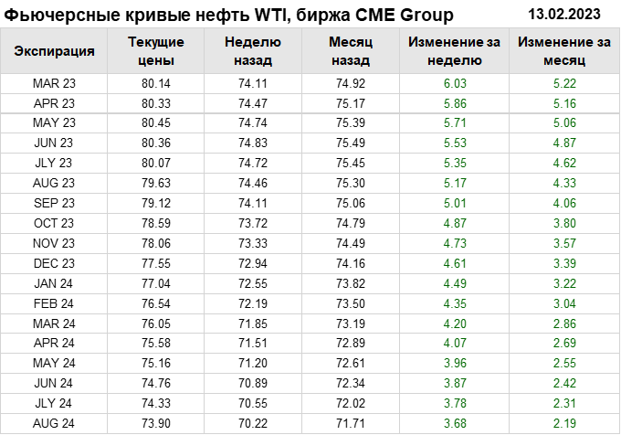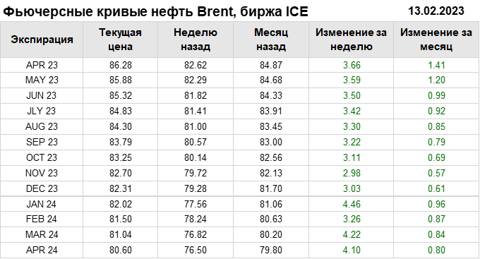 Нефть. Фьючерсные кривые на 13 февраля 2023
