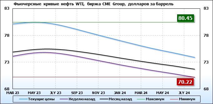 На 13.02.23 стоимость нефти марки WTI на бирже CME Group по контракту MAR 23 составила 80.14 доллара за баррель. За прошедшую неделю стоимость нефти марки WTI выросла на 6.03 $/баррель. Как мы видим на графике, фьючерсная кривая имеет периоды, когда более дальний фьючерс дешевле ближнего. Состояние бэквардации наблюдаем на следующих контрактах: JUN 23; JLY 23; AUG 23; SEP 23; OCT 23; NOV 23; DEC 23; JAN 24; FEB 24; MAR 24; APR 24; MAY 24; JUN 24; JLY 24; AUG 24. Таким образом, трейдеры предполагают, что возможно превалирование предложения над спросом в указанные периоды, если рынок будет находиться на данных ценовых уровнях.