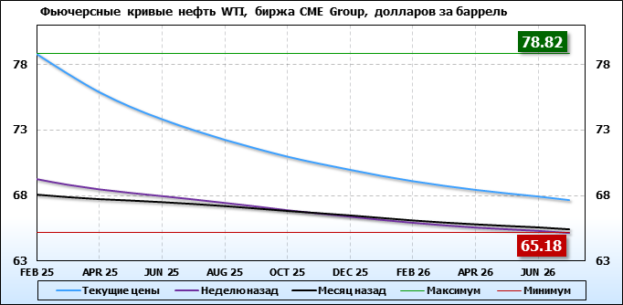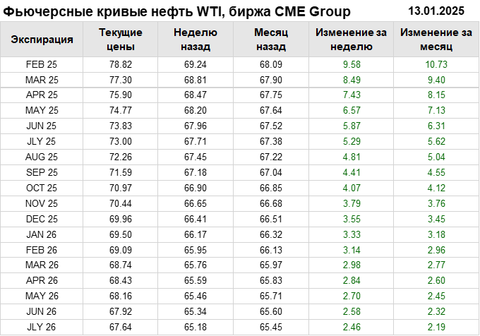 На 13.01.25 стоимость нефти марки WTI на бирже CME Group по контракту FEB 25 составила 78.82 доллара за баррель. За прошедшую неделю стоимость нефти марки WTI выросла на 9.58 $/баррель. Как мы видим на графике, фьючерсная кривая имеет периоды, когда более дальний фьючерс дешевле ближнего. Состояние бэквардации наблюдаем на следующих контрактах: MAR 25; APR 25; MAY 25; JUN 25; JLY 25; AUG 25; SEP 25; OCT 25; NOV 25; DEC 25; JAN 26; FEB 26; MAR 26; APR 26; MAY 26; JUN 26; JLY 26.  Таким образом, трейдеры предполагают, что возможно превалирование предложения над спросом в указанные периоды, если рынок будет находиться на данных ценовых уровнях.