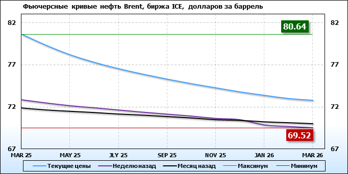 На 13.01.25 стоимость нефти марки Brent на бирже ICE по контракту MAR 25 составила 80.64 доллара за баррель. За прошедшую неделю стоимость нефти марки Brent  выросла на 7.8 $/баррель. Как мы видим на графике, фьючерсная кривая имеет периоды, когда более дальний фьючерс дешевле ближнего. Состояние бэквардации наблюдаем на следующих контрактах: APR 25; MAY 25; JUN 25; JLY 25; AUG 25; SEP 25; OCT 25; NOV 25; DEC 25; JAN 26; FEB 26; MAR 26. Таким образом, трейдеры предполагают, что возможно превалирование предложения над спросом в указанные периоды, если рынок будет находиться на данных ценовых уровнях.