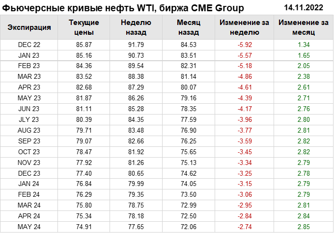 Нефть. Фьючерсные кривые на 14 ноября 2022