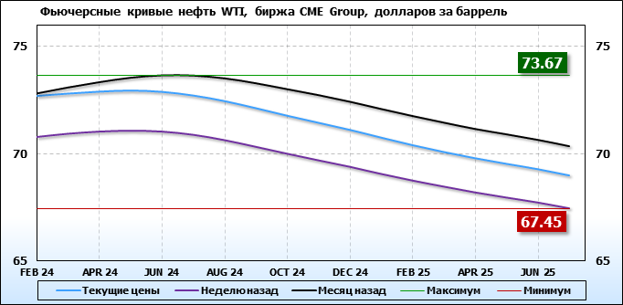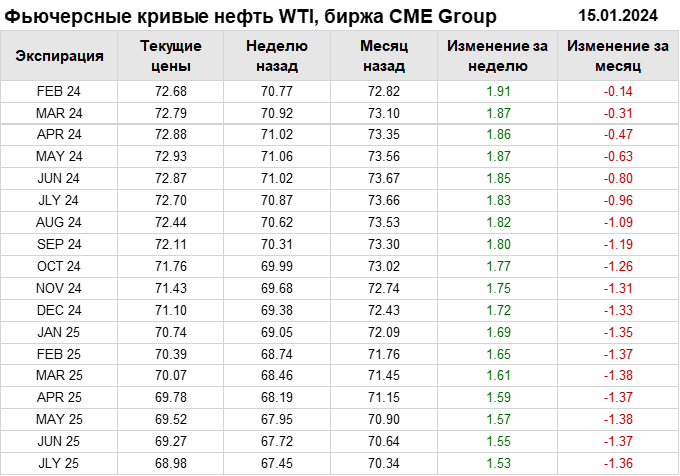 На 15.01.24 стоимость нефти марки WTI на бирже CME Group по контракту FEB 24 составила 72.68 доллара за баррель. За прошедшую неделю стоимость нефти марки WTI выросла на 1.91 $/баррель. Как мы видим на графике, фьючерсная кривая имеет периоды, когда более дальний фьючерс дешевле ближнего. Состояние бэквардации наблюдаем на следующих контрактах: JUN 24; JLY 24; AUG 24; SEP 24; OCT 24; NOV 24; DEC 24; JAN 25; FEB 25; MAR 25; APR 25; MAY 25; JUN 25; JLY 25. Таким образом, трейдеры предполагают, что возможно превалирование предложения над спросом в указанные периоды, если рынок будет находиться на данных ценовых уровнях.