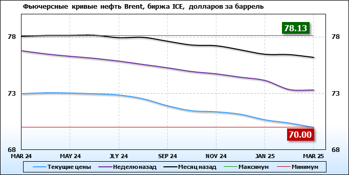 На 15.01.24 стоимость нефти марки Brent на бирже ICE по контракту MAR 24 составила 72.97 доллара за баррель. За прошедшую неделю стоимость нефти марки Brent упала на 3.8 $/баррель. Как мы видим на графике, фьючерсная кривая имеет периоды, когда более дальний фьючерс дешевле ближнего. Состояние бэквардации наблюдаем на следующих контрактах: ; MAY 24; JUN 24; JLY 24; AUG 24; SEP 24; OCT 24; NOV 24; DEC 24; JAN 25; FEB 25; MAR 25. Таким образом, трейдеры предполагают, что возможно превалирование предложения над спросом в указанные периоды, если рынок будет находиться на данных ценовых уровнях.