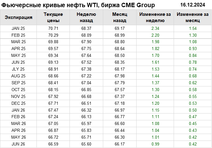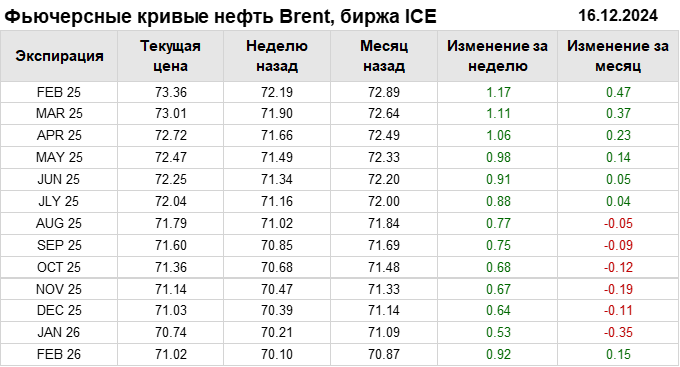 Нефть. Фьючерсные кривые на 16 декабря 2024