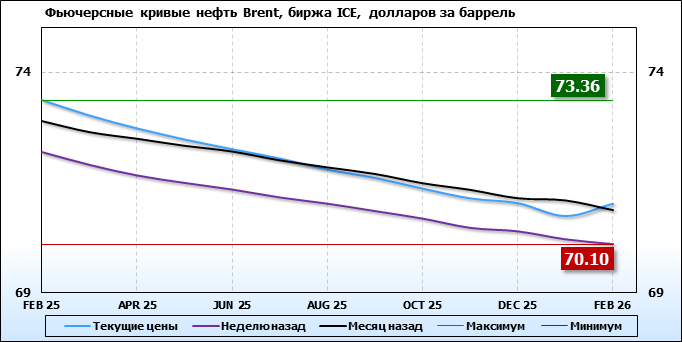 На 16.12.24 стоимость нефти марки Brent на бирже ICE по контракту FEB 25 составила 73.36 доллара за баррель. За прошедшую неделю стоимость нефти марки Brent  выросла на 1.17 $/баррель. Как мы видим на графике, фьючерсная кривая имеет периоды, когда более дальний фьючерс дешевле ближнего. Состояние бэквардации наблюдаем на следующих контрактах: MAR 25; APR 25; MAY 25; JUN 25; JLY 25; AUG 25; SEP 25; OCT 25; NOV 25; DEC 25; JAN 26.  Таким образом, трейдеры предполагают, что возможно превалирование предложения над спросом в указанные периоды, если рынок будет находиться на данных ценовых уровнях.