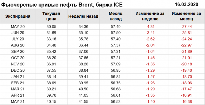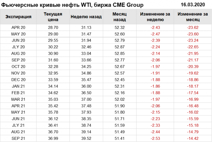 Нефть. Фьючерсные кривые на 16 марта 2020