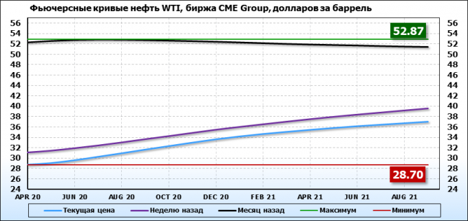 На 16.03.20 стоимость нефти марки WTI на бирже CME Group по контракту APR 20 составила 28.7 долларов за баррель. За прошедшую неделю стоимость нефти марки WTI упала на 2.43 $/баррель. Как мы видим на графике, фьючерсная кривая на всем своем протяжении находится в состоянии контанго. Трейдеры не предполагают превышения предложения над спросом при сохранении текущих цен.