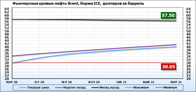 На 16.03.20 стоимость нефти марки Brent на бирже ICE по контракту MAY 20 составила 30.05 долларов за баррель. За прошедшую неделю стоимость нефти марки Brent упала на 4.31 $/баррель. Как мы видим на графике, фьючерсная кривая на всем своем протяжении находится в состоянии контанго.