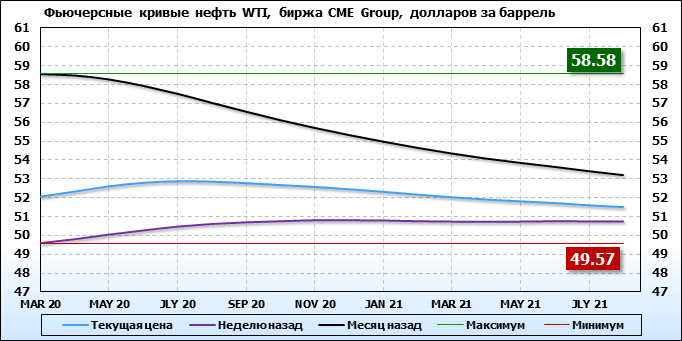 На 17.02.20 стоимость нефти марки WTI на бирже CME Group по контракту MAR 20 составила 52.05 доллара за баррель. За прошедшую неделю стоимость нефти марки WTI выросла на 2.48 $/баррель. Как мы видим на графике, фьючерсная кривая имеет периоды, когда более дальний фьючерс дешевле ближнего. Состояние бэквардации наблюдаем на следующих контрактах: AUG 20; SEP 20; OCT 20; NOV 20; DEC 20; JAN 21; FEB 21; MAR 21; APR 21; MAY 21; JUN 21; JLY 21; AUG 21. Таким образом, трейдеры предполагают, что возможно превалирование предложения над спросом в указанные периоды, если рынок будет находиться на данных ценовых уровнях.