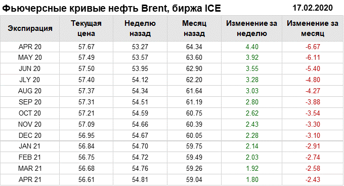 Нефть. Фьючерсные кривые на 17 февраля 2020