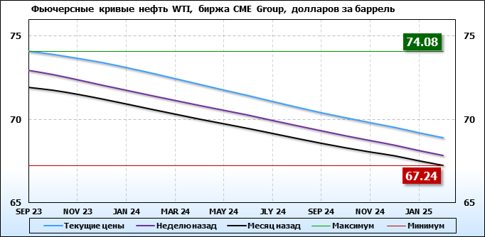 На 17.07.23 стоимость нефти марки WTI на бирже CME Group по контракту SEP 23 составила 74.08 доллара за баррель. За прошедшую неделю стоимость нефти марки WTI выросла на 1.13 $/баррель. Как мы видим на графике, фьючерсная кривая имеет периоды, когда более дальний фьючерс дешевле ближнего. Состояние бэквардации наблюдаем на следующих контрактах: OCT 23; NOV 23; DEC 23; JAN 24; FEB 24; MAR 24; APR 24; MAY 24; JUN 24; JLY 24; AUG 24; SEP 24; OCT 24; NOV 24; DEC 24; JAN 25; FEB 25. Таким образом, трейдеры предполагают, что возможно превалирование предложения над спросом в указанные периоды, если рынок будет находиться на данных ценовых уровнях.