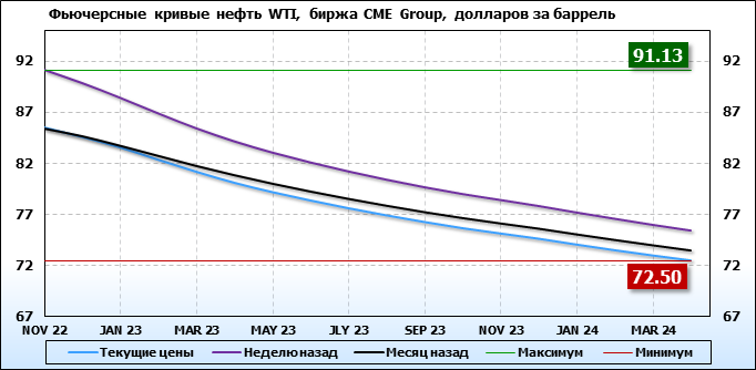 На 17.10.22 стоимость нефти марки WTI на бирже CME Group по контракту NOV 22 составила 85.46 доллара за баррель. За прошедшую неделю стоимость нефти марки WTI упала на 5.67 $/баррель. Как мы видим на графике, фьючерсная кривая имеет периоды, когда более дальний фьючерс дешевле ближнего. Состояние бэквардации наблюдаем на следующих контрактах: DEC 22; JAN 23; FEB 23; MAR 23; APR 23; MAY 23; JUN 23; JLY 23; AUG 23; SEP 23; OCT 23; NOV 23; DEC 23; JAN 24; FEB 24; MAR 24; APR 24. Таким образом, трейдеры предполагают, что возможно превалирование предложения над спросом в указанные периоды, если рынок будет находиться на данных ценовых уровнях.