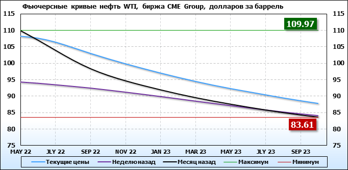 На 18.04.22 стоимость нефти марки WTI на бирже CME Group по контракту MAY 22 составила 108.21 долларов за баррель. За прошедшую неделю стоимость нефти марки WTI выросла на 13.92 $/баррель. Как мы видим на графике, фьючерсная кривая имеет периоды, когда более дальний фьючерс дешевле ближнего. Состояние бэквардации наблюдаем на следующих контрактах: JUN 22; JLY 22; AUG 22; SEP 22; OCT 22; NOV 22; DEC 22; JAN 23; FEB 23; MAR 23; APR 23; MAY 23; JUN 23; JLY 23; AUG 23; SEP 23; OCT 23. Таким образом, трейдеры предполагают, что возможно превалирование предложения над спросом в указанные периоды, если рынок будет находиться на данных ценовых уровнях.